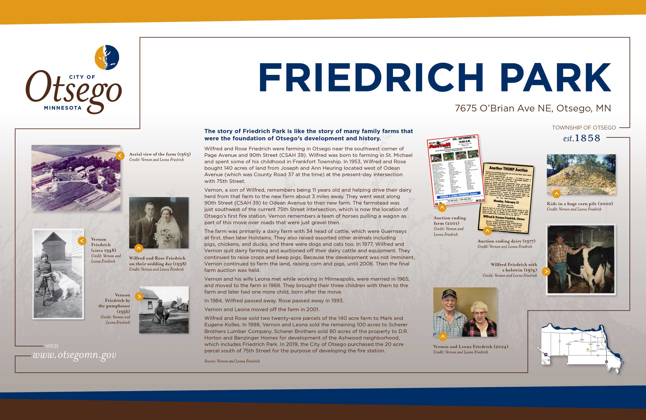Discover the history of the land Wilfred and Rose Friedrich purchased - 140 acres near what is now Odean Avenue and 75th Street in Otsego in 1953, where they and their son Vernon ran a mixed dairy and crop farm for decades. Over time the land was sold for residential development—including the neighborhood park named in their honor.