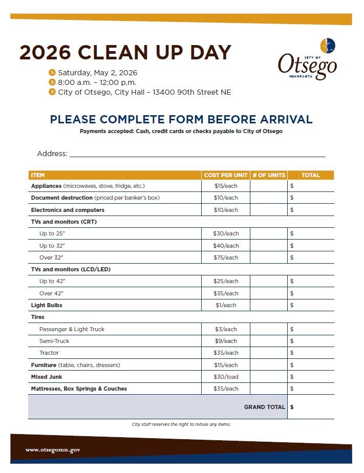 Saturday, May 2, 20268:00 am - NoonCity of Otsego, City Hall - 13400 90th Street NE